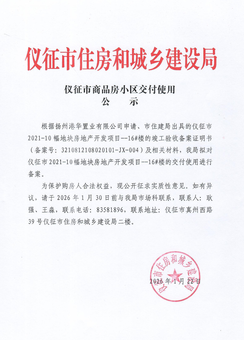 仪征市商品房小区交付使用公示(仪征市2021-10幅地块房地产开发项目16#楼)
