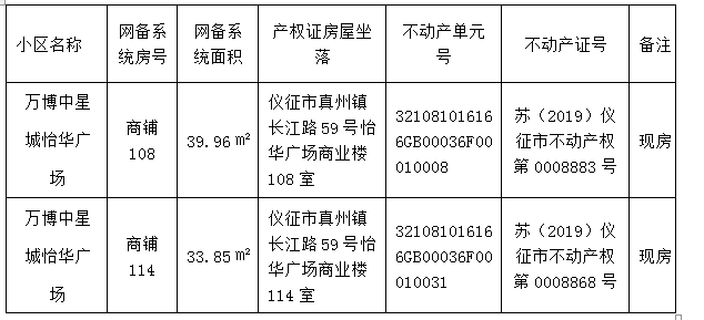 江苏万博集团有限公司开发的部分现房,拟办理抵押手续,请有意购买这部分拟抵押房源的购房人登陆仪征市房地产信息(“www.yzfcxxw.cn”)-“新房搜索”-搜索该项目-“网上销售公示”查询您意向购买房屋的销售状态,房源具体信息如下: