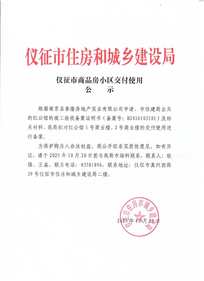 仪征市商品房小区交付使用公示(红公馆1#商业楼、2#商业楼)