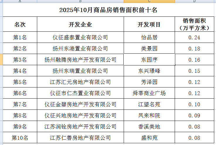 2025年10月商品房销售面积前十名