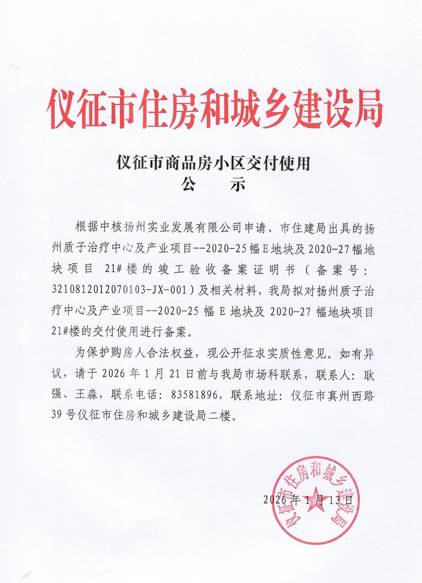 仪征市商品房小区交付使用公示(2020-25幅E地块及2020-27幅地块项目21#楼)