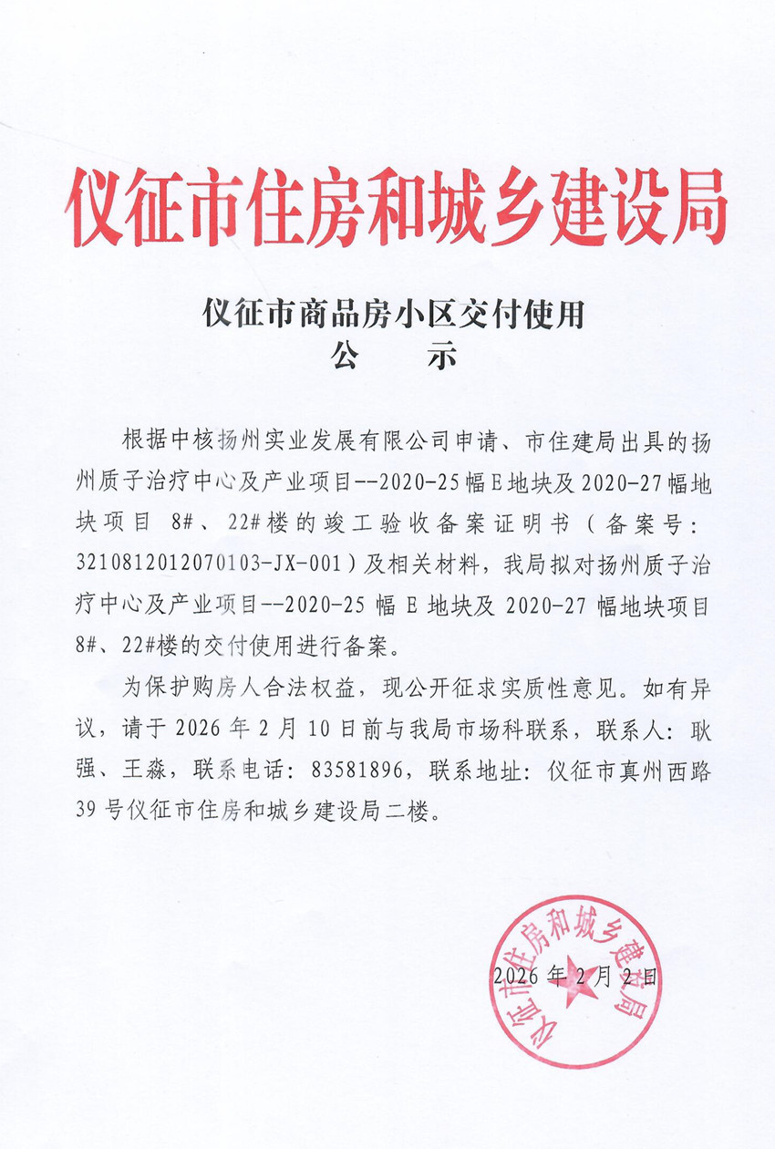仪征市商品房小区交付使用公示(2020-25幅E地块及2020-27幅地块项目8#、22#楼)