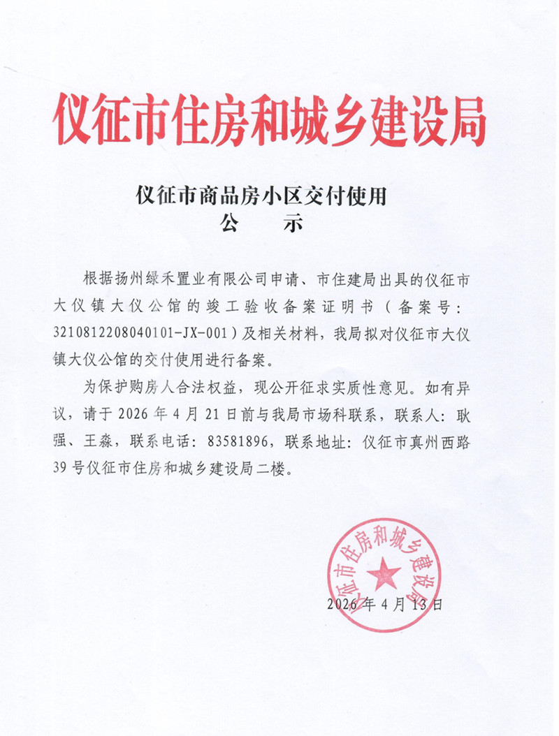 仪征市商品房小区交付使用公示(仪征市大仪镇大仪公馆)